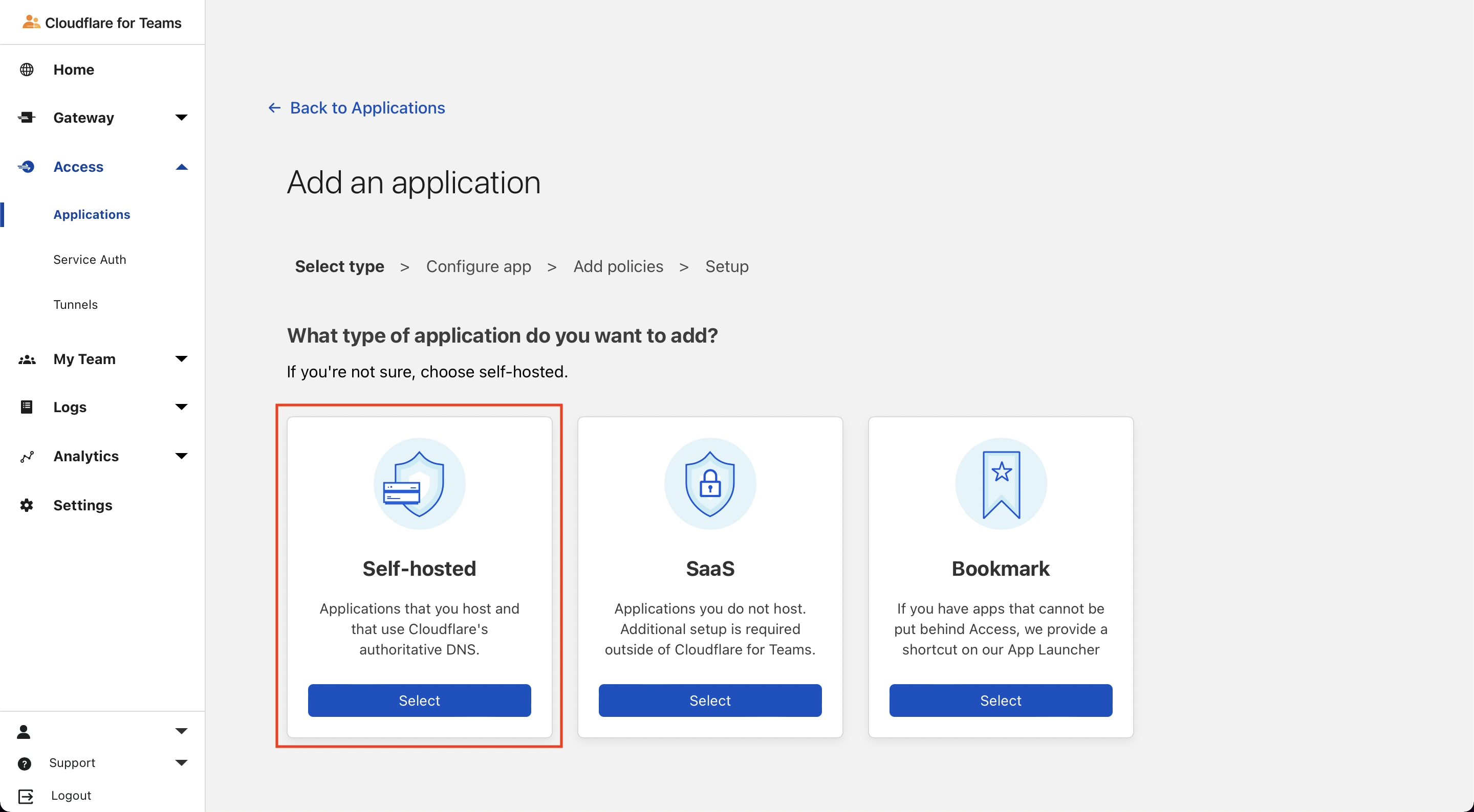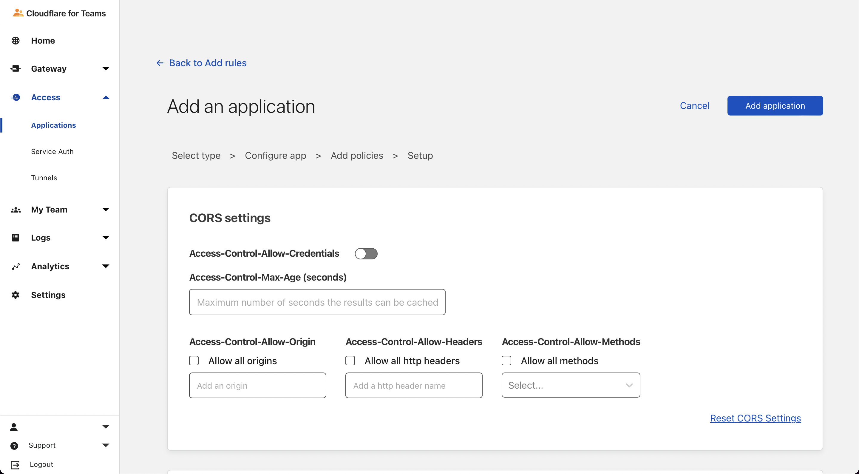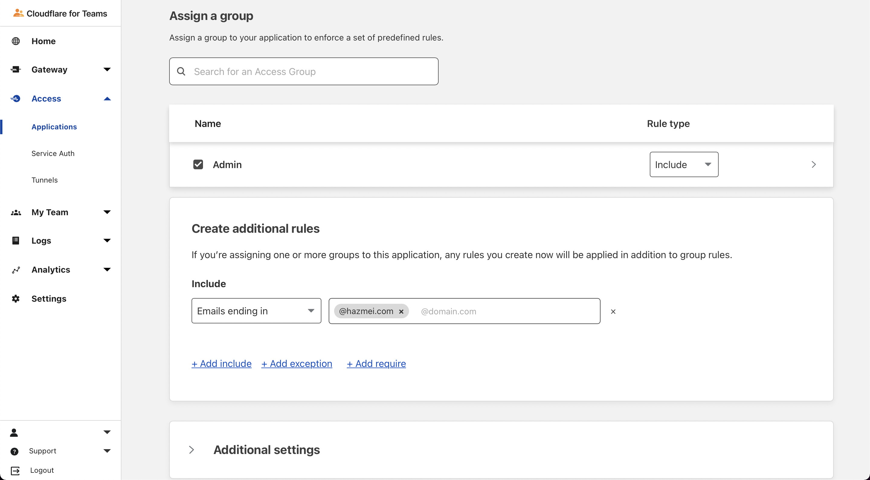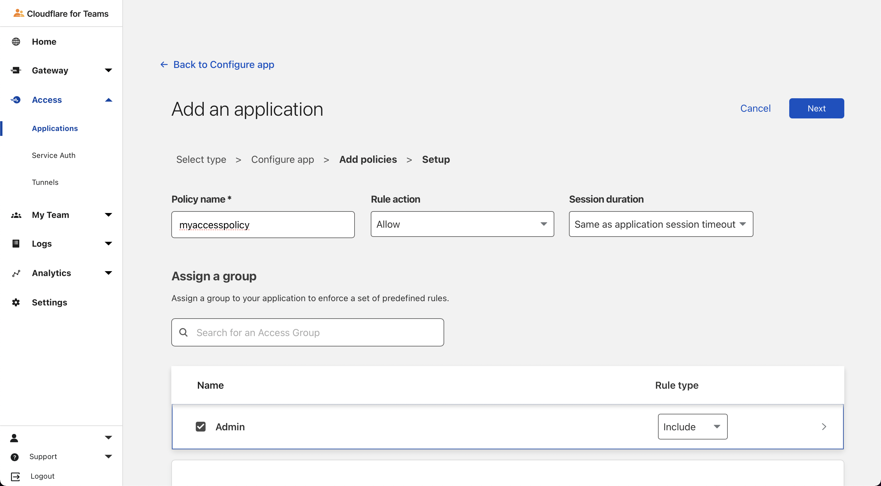 NextHere we will define the policies for which kind of traffic to deny / allow to the application.yaml Policy Name: <Anything> Action: Allow Assign the action to an Access Group and select Require under Rule type Under Create additional rules, include emails ending in your own domain or specific email.