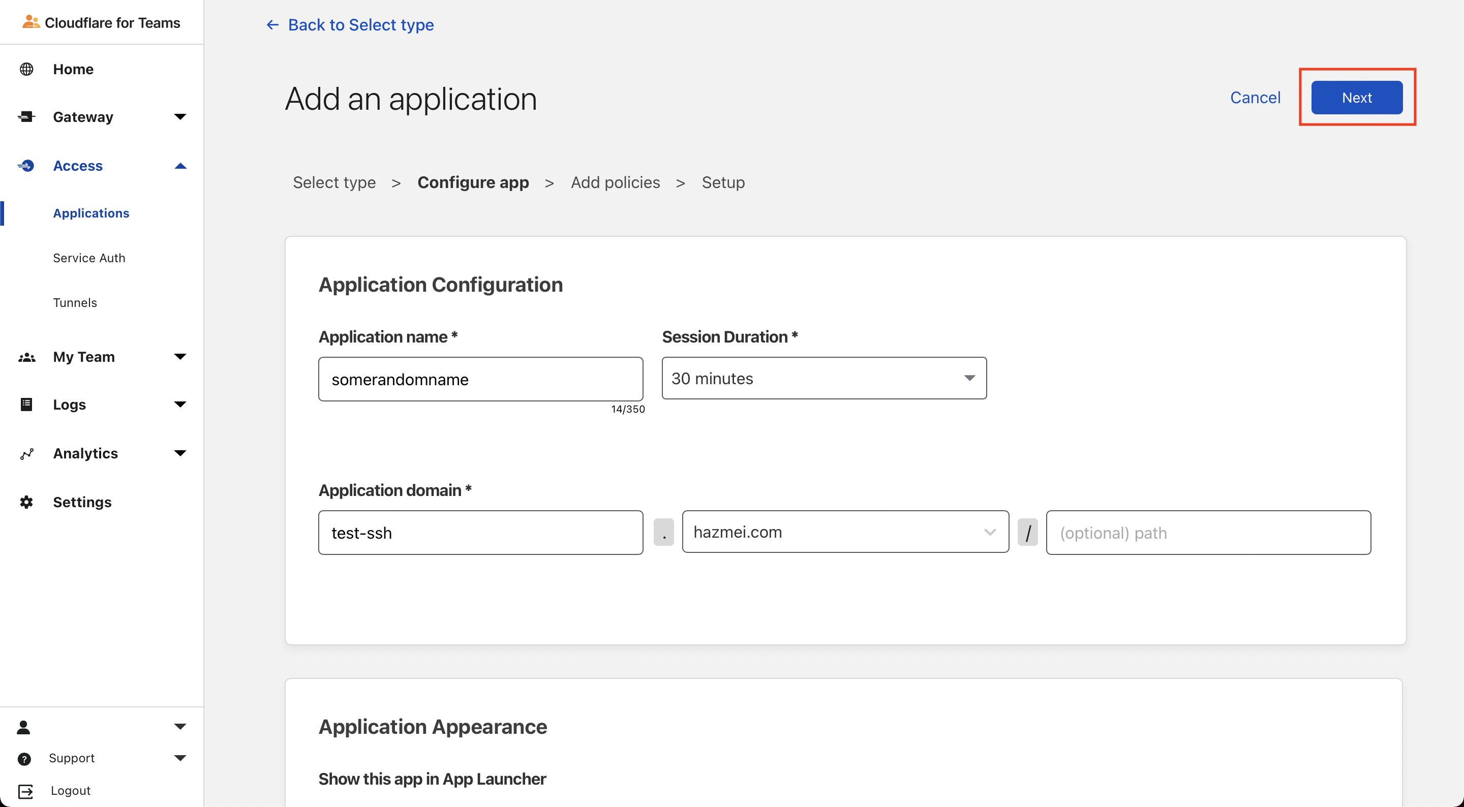 Application Configuration, key in the following:yaml Application name: <Anything> Session Duration: 30 minutes Application domain: test-ssh.hazmei.comWe will be using the defaultOne-time PINunder Identity providers for simplicity